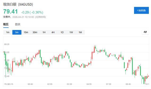 现货白银价仍处回落态势,跌幅达0.36%,报79.41美元。